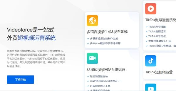 Videoforce是一站式外贸短视频运营系统。创新外贸短视频运营思路,突破传统外贸运营模式,为用户提供私域短视频网站系统服务、TikTok短视频平台的运营服务、YouTube视频平台运营服务。紧跟时代潮流,开发外贸短视频新市场,帮助用户实现产品的全球化。