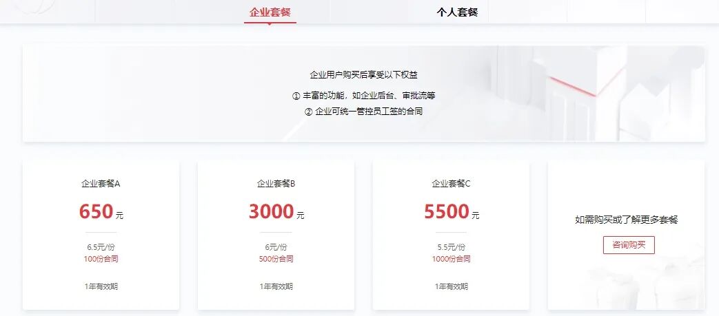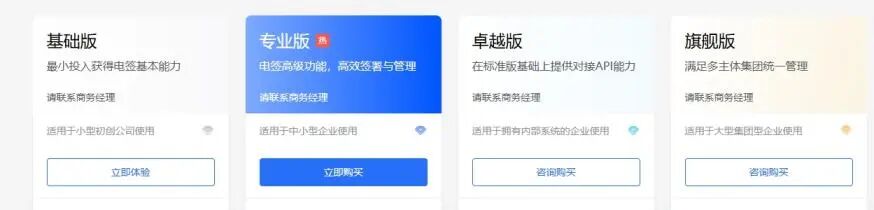 旗舰版(含API):250,000/年,满足多元业务签署协同及管控需求,适合拥有内部操作系统的大型集团公司使用。