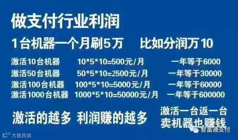 6.无限新增下级代理,一个代理帮你发出5台,同时让代理再发展下级代理,这样的裂变式发展,只要人数够多,机器发出的够多,月流水够多,哪怕只吃万1(0.01%),收入也是很客观的。