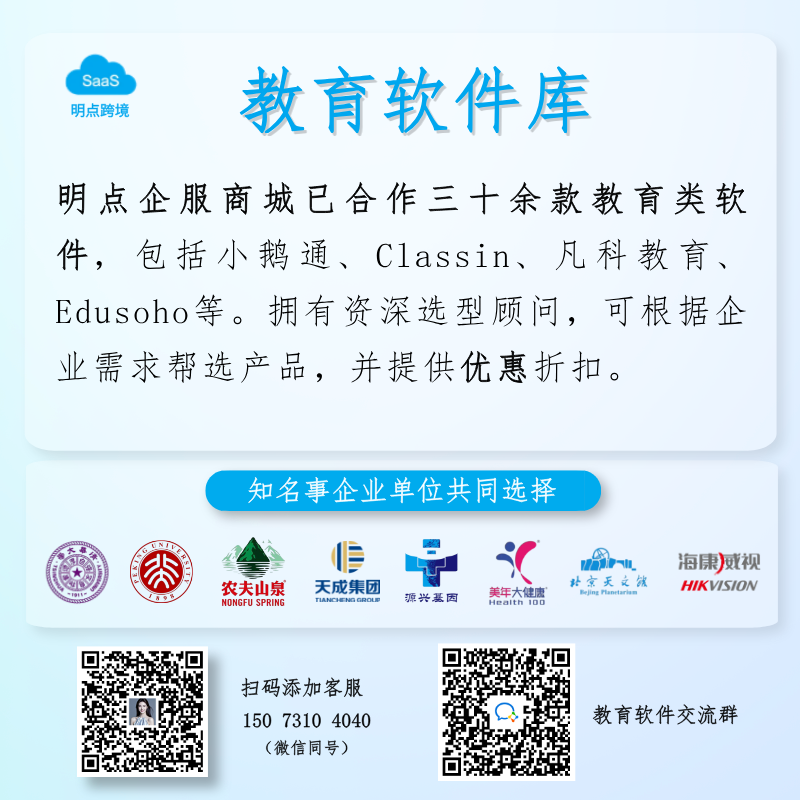 如果需要采购希沃白板或者Classin,可以通过我们企服商城购买,这边是软件超市,代理合作了希沃白板、Classin、小鹅通、创客匠人等多款教育平台,我们会有专业选型顾问帮您介绍推荐匹配的产品/版本,还有专属优惠福利可以领取。