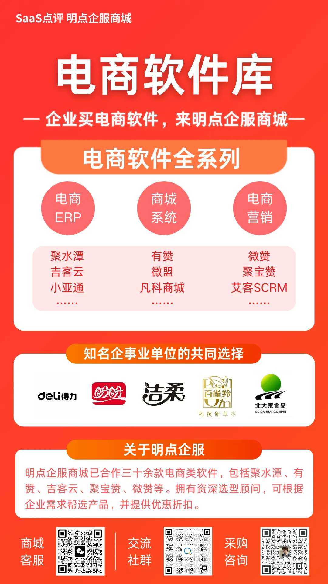 以上就是关于2025年常见6个微商城系统推荐的相关内容,如果需要电商系统可以通过我们购买,明点企服商城为企业提供各类SaaS软件产品,目前已合作100余款国外优质产品,如聚宝赞、有赞、微盟、凡科商城、启博微分销、海商等多款电商系统,扫码添加顾问,拉你进群领取详细对比资料/免费试用。