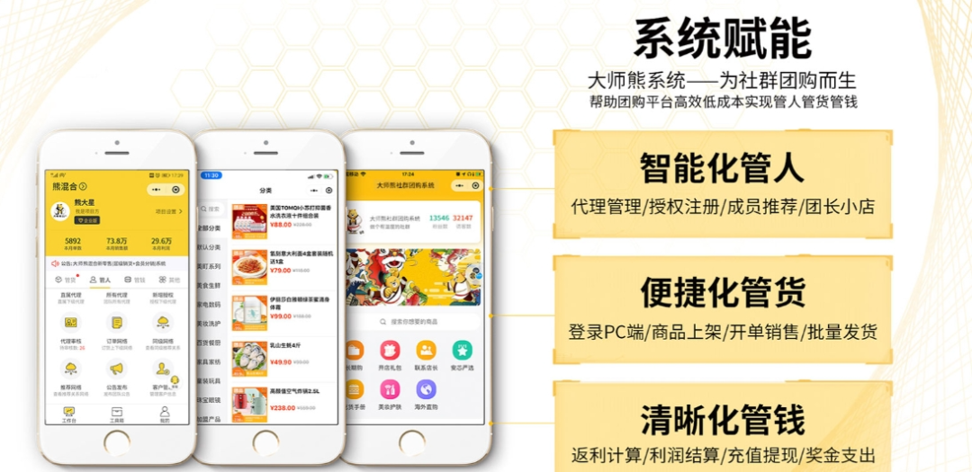 大师熊是一款专门为私域创业者设计,解决商家在技术开发、运营协同、链接上下游等技术难题。在运营端提供私域会员的展业、分佣,为商家提供会员管理、佣金模式设计和合规发放、供应链商品管理等体系化功能。