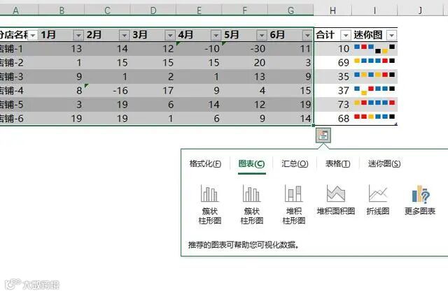 或者选中区域按住快捷键CTRL+Q快速分析得到更多的可视化图表