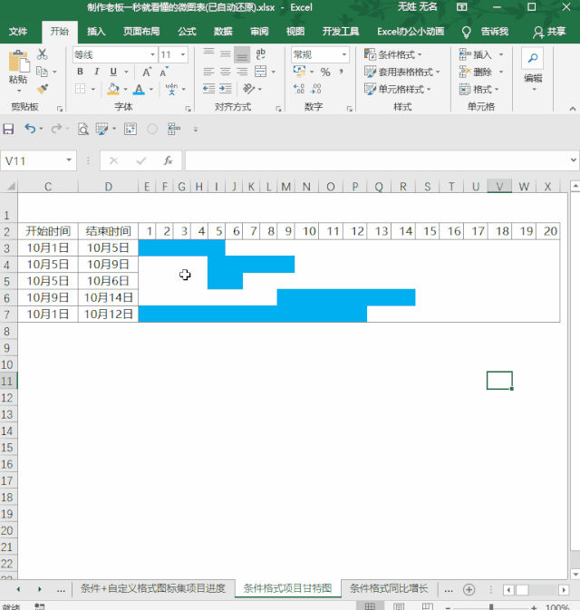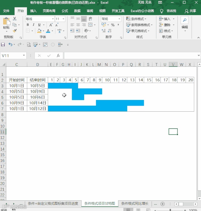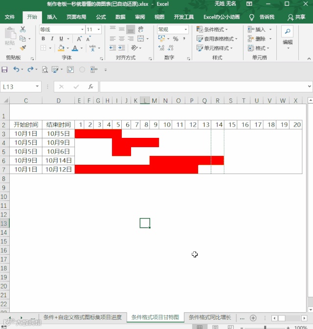 选中区域——条件格式——新建规则——使用公式确定单元格的格式——输入公式=(E$2>=$C3)*(E$2<=$D3),当然你也可以为每个项目设置条件格式,在选择区域的时候改为选择整行就Ok啦