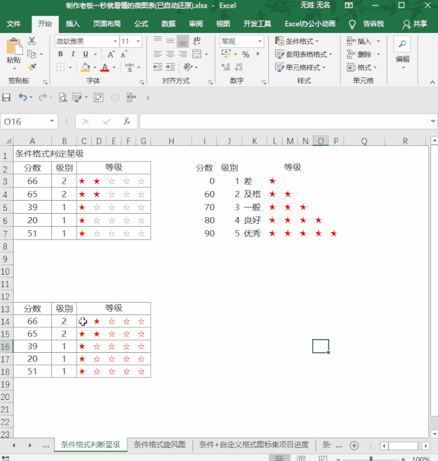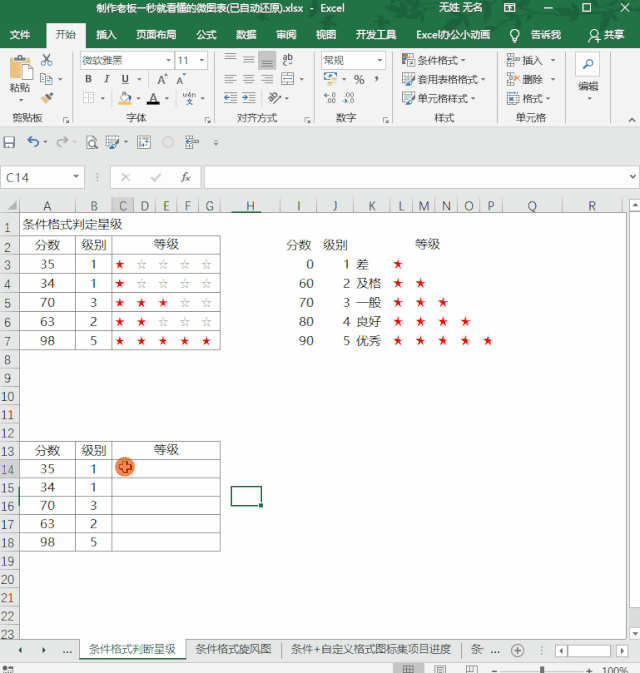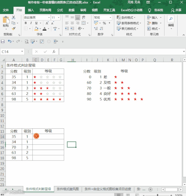 1、在C14中输入公式=IF(COLUMN(A1)>$B14,"☆","★")向右/下填充公式即可