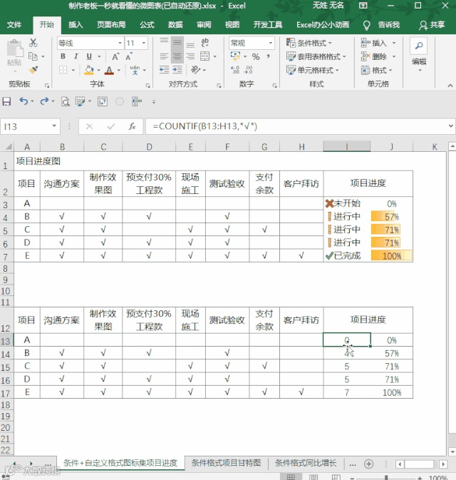 按ctrl+1设置单元格的格式——自定义——在类型中输入[<1]未开始;[<7]进行中;已完成