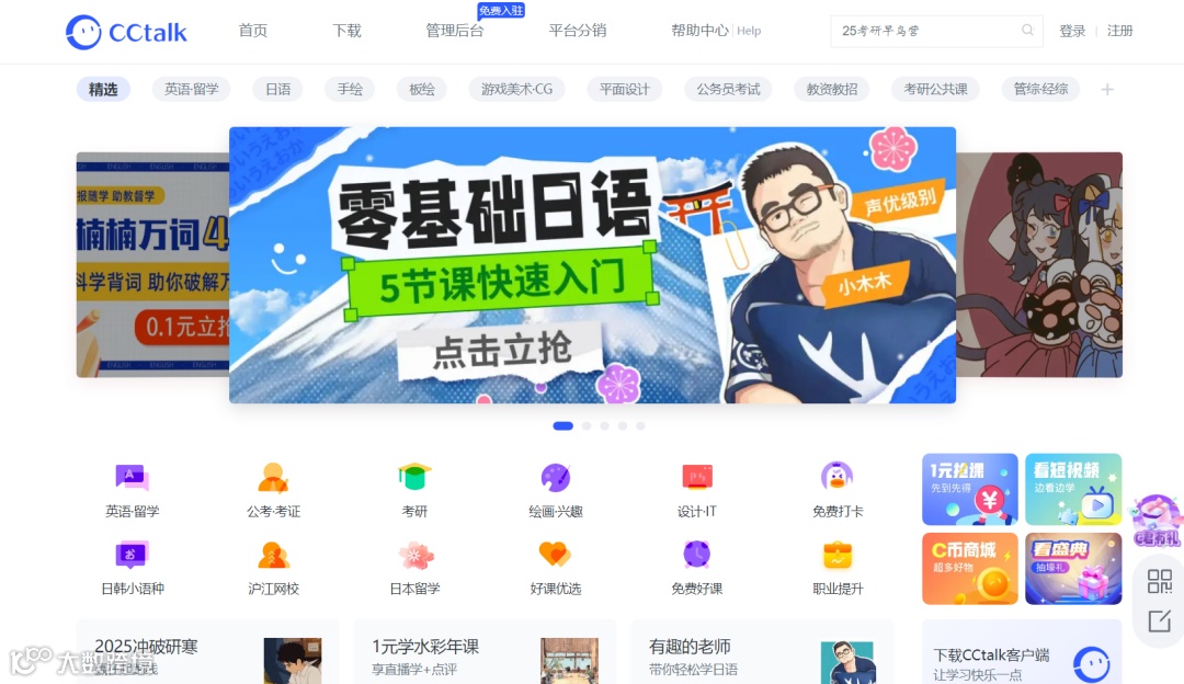CC的含义是Content(内容)和Community(社区),专注知识分享领域。内容方面涵盖了语言类、职业教育、艺术、美术、兴趣、公考、IT培训等十几个品类,汇聚了数万名讲师/创作者,利用平台的在线交付及分享能力,和世界各地的学员无界交流。学员们不再是自己孤独的学习,逐步融入以兴趣为核心的学习性社区。