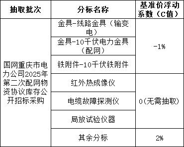 国网重庆市电力公司2025年第二次配网物资协议库存公开招标采购项目于开标当日现场抽取基准价浮动系数(C值),并由监督人员现场见证。抽取情况公示如下: