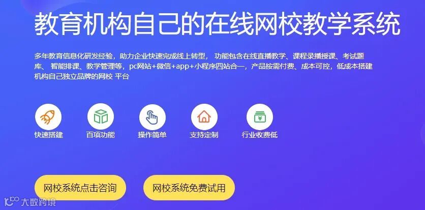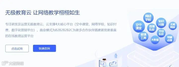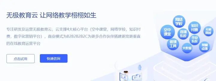 无极教育云专注研发及运营无极教育云,云支撑4大核心平台(空中课堂,网络学校,知识付费,数字化营销平台),商业模式为B2B2B2B2C为更多合作伙伴搭建更宽更垂直的在线教育运营平台。