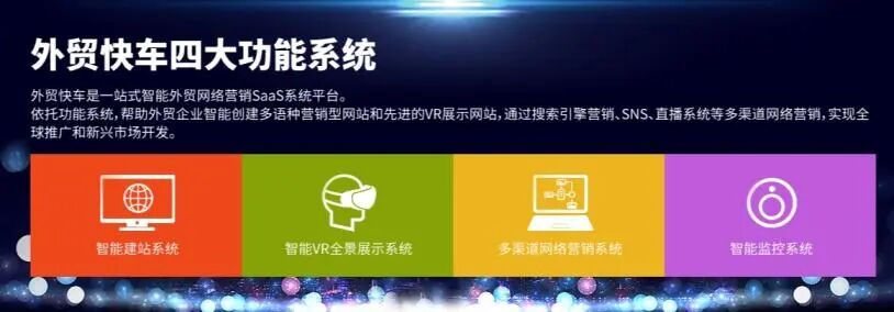 外贸快车是中国外贸独立站一站式解决方案SaaS系统,包括智能建站系统、多功能独立站管理系统、多方式在线治谈系统、独立站智能分析系统四大功能系统,为中国外贸企业提供独立站的建站、管理、洽谈、分析环节的一站式解决方案,帮助中国外贸企业通过独立站获得全球采购商增加出口,帮助中国外贸企业通过独立站品牌出海、数字化转型拓展全球新兴市场。