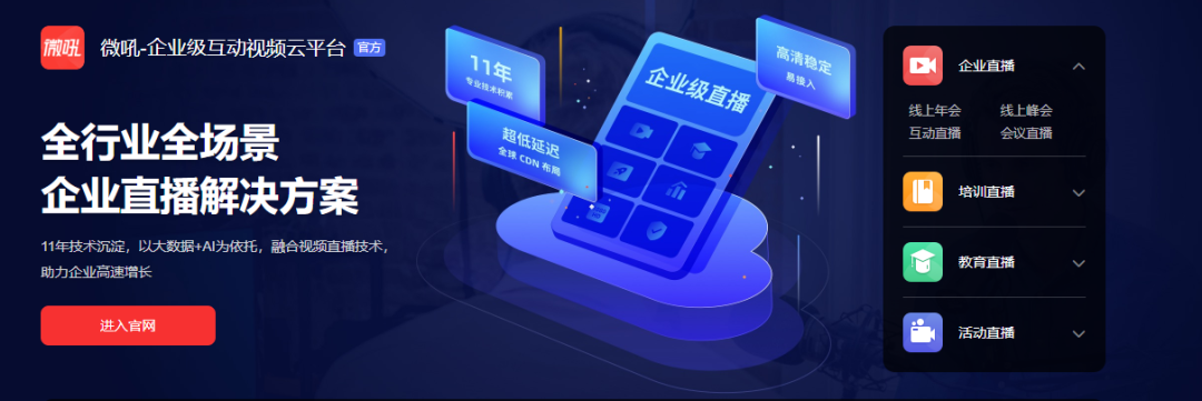 微吼10年专注企业直播,累积500万场直播,服务30万客户,为金融,教育,医疗等行业提供专业的云视频直播解决方案,助力企业玩转直播北京微吼时代科技有限公司。