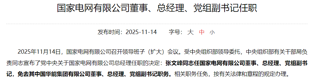 2025年11月14日,国家电网有限公司召开领导班子(扩大)会议。受中央组织部领导委托,中央组织部有关干部局负责同志宣布了党中央关于国家电网有限公司总经理任职的决定:张文峰同志任国家电网有限公司董事、总经理、党组副书记,免去其中国华能集团有限公司董事、总经理、党组副书记职务。相关职务任免,按有关法律和章程的规定办理。