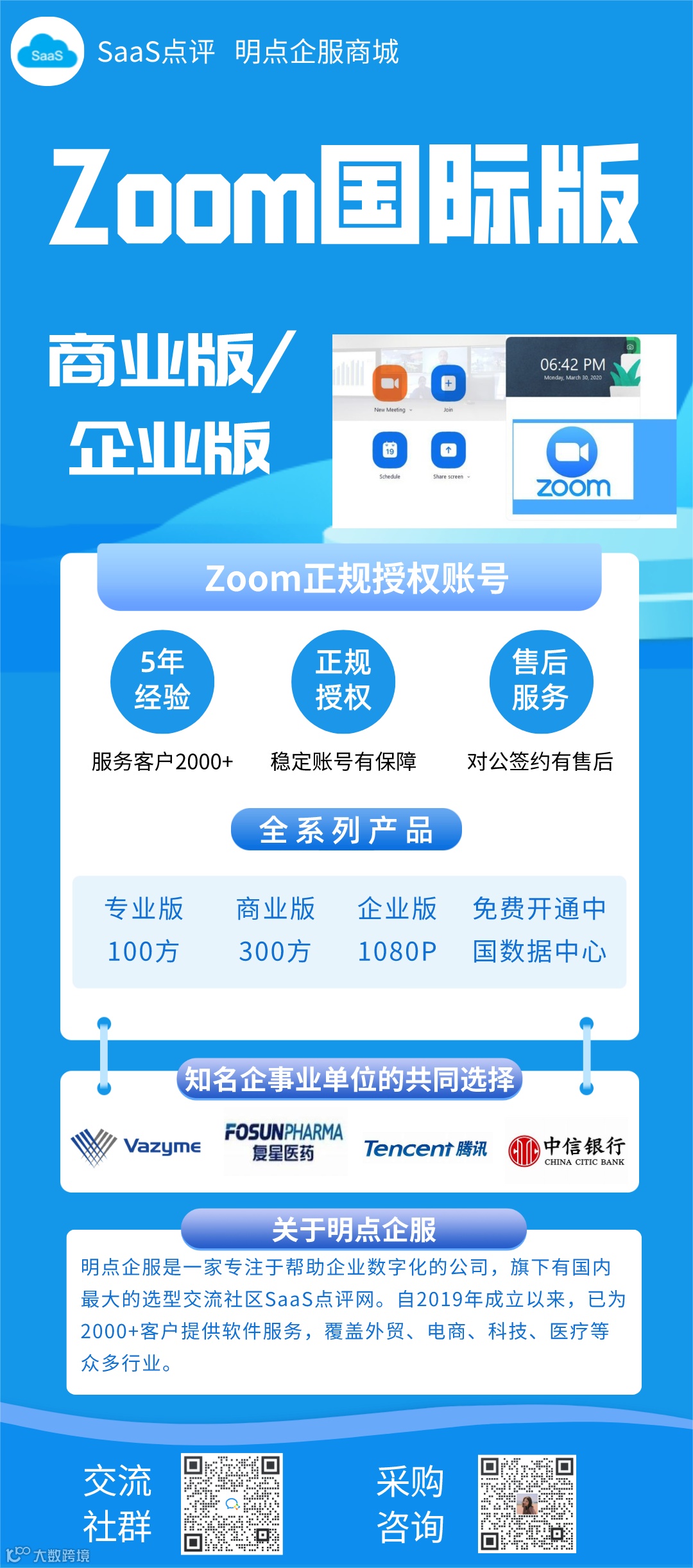 我们是Zoom官方授权代理的渠道,可以为大家提供稳定正规的Zoom国际版账号,100方、300方、500方、1080P、中国数据中心都可以。有需求请直接扫码咨询艾拉~