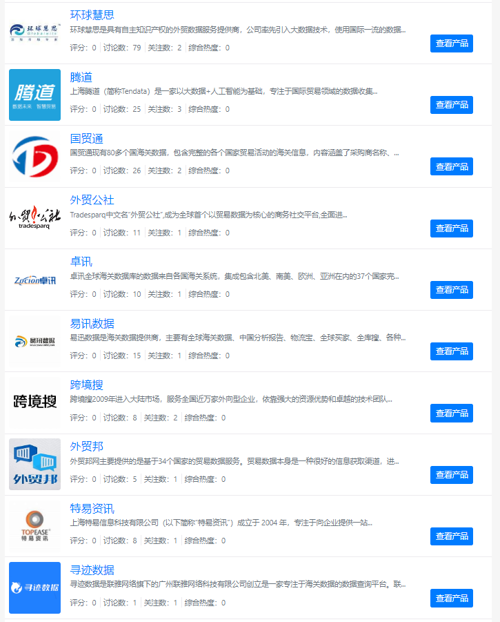 涉及公司较多(帝擎、猎搜、讯德、小多)都是,数据质量相对可以,如果提供市场能满足你,可以选择,小部分国家没有数据,东欧东南亚数据偶有重复和缺失。