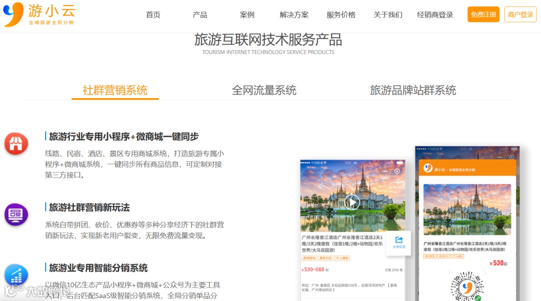 1)游小云SaaS系统:游小云为旅游企业用户提供高纬度数据化安全防护与管理,同时提供旅游小程序、saas小程序开发、旅游SaaS源码等服务。其系统采用阿里云数据安全架构,保障用户数据安全,并同步享受SaaS云免费升级服务。