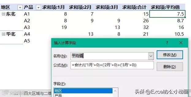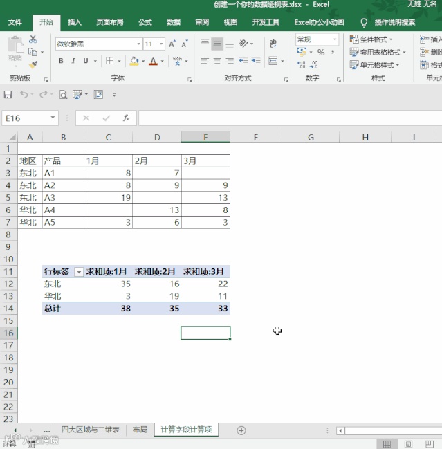 对于大于二维表一般是无法汇总求和的,比如我想按照地区得到A产品3个月的总销量,这时候计算字段极大扩展了数据透视表的计算功能。当然你也可以选择其他计算平均值等或者还需要计算销售员提成等等。在分析选项卡添加计算字段公式='1月'+'2月'+ '3月' 或者=SUM('1月','2月', '3月' )。这里需要注意的是当字段中有数字就可以输入=1月+2月+3月,但是当为我文本的时候,比如地区为列字段的时候总计可以直接输入=东北+华北