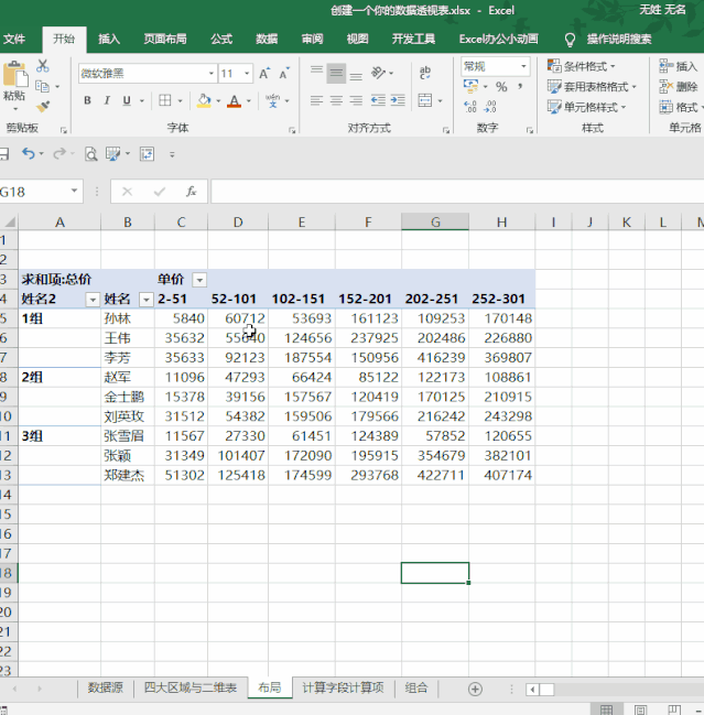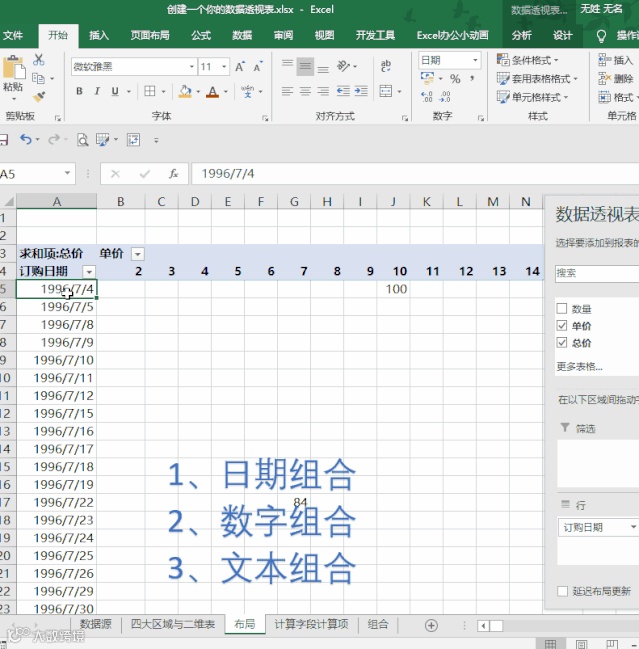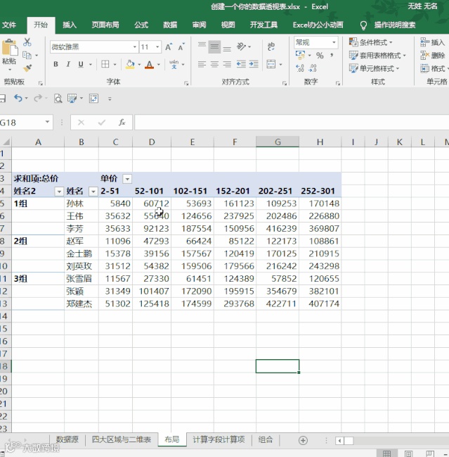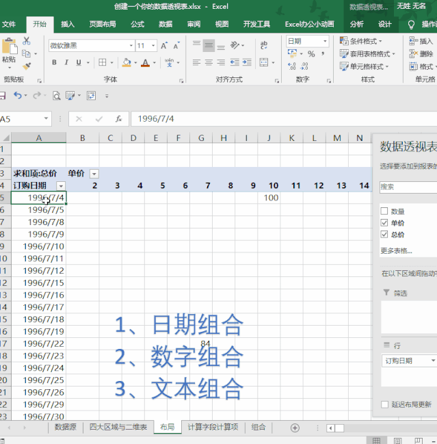 数字组合:比如我想查看不同单价区间的销售额,选中列标签任意一个单价后点击右键,选中组合,设置单价的起始数据,步长就是以50为增长