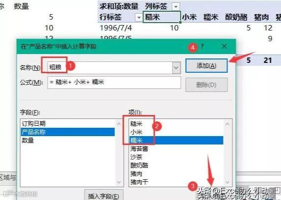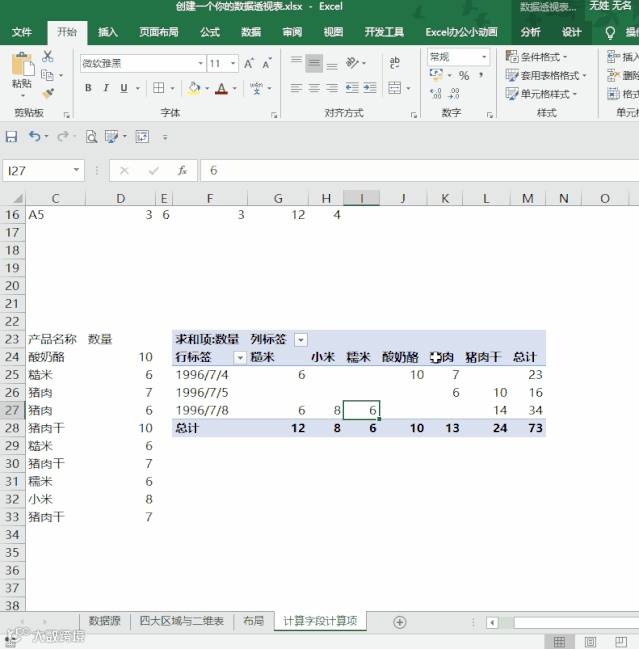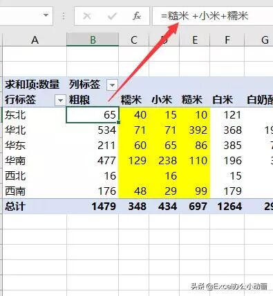 计算项的公式在编辑栏中是可以看到的,而且比如在华北地区的粗粮销售额我不想汇总小米的数量,此时将公式就可以在编辑栏中修改为=糙米+小米。但是计算字段是在编辑栏中是看不到公式的!