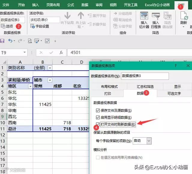 数据透视表的一个优势就是:当数据源变更后更新了就可反映到数据报表中。这种变化体现第一种如果只是数据源中的数值内容发生变化了,点击鼠标右键刷新即可得到实时变化!另外一个设置就是在透视表选项中【打开文件时候刷新数据】