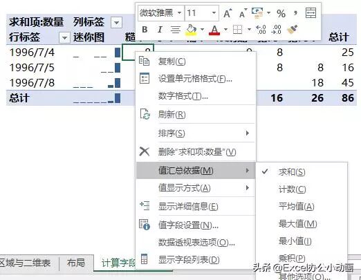 在分析选项卡下插入计算项,输入名称后添加不同类型的迷你图。