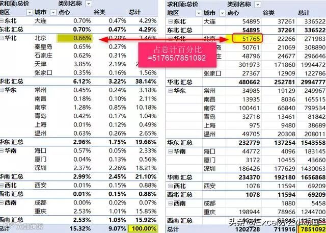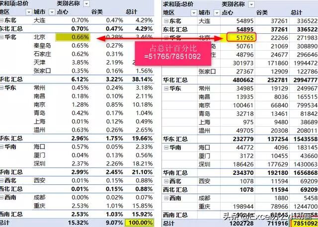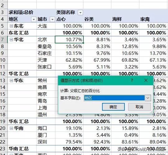 总计的百分比就是分析个体占整体的情况,比如求出每个类别的销售额在各个地区的销售占比,这个基本字销售地区就是作为分母,各小组地区里百分比总计就是100%。以点心销售为例子在北京的销售为51765,华北地区所有城市的点心总销售为480662,所以北京销售额在华北地区的占比为10.77%,那么点心在所有城市销售额总计百分比为100%。