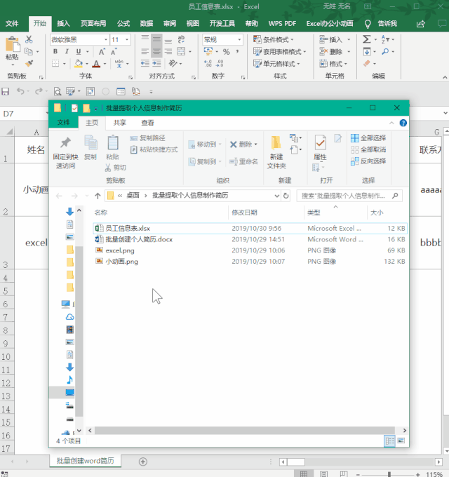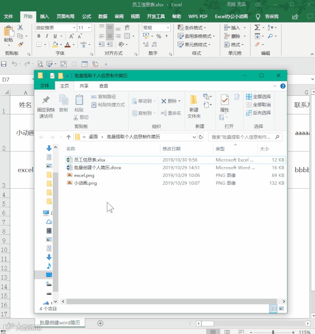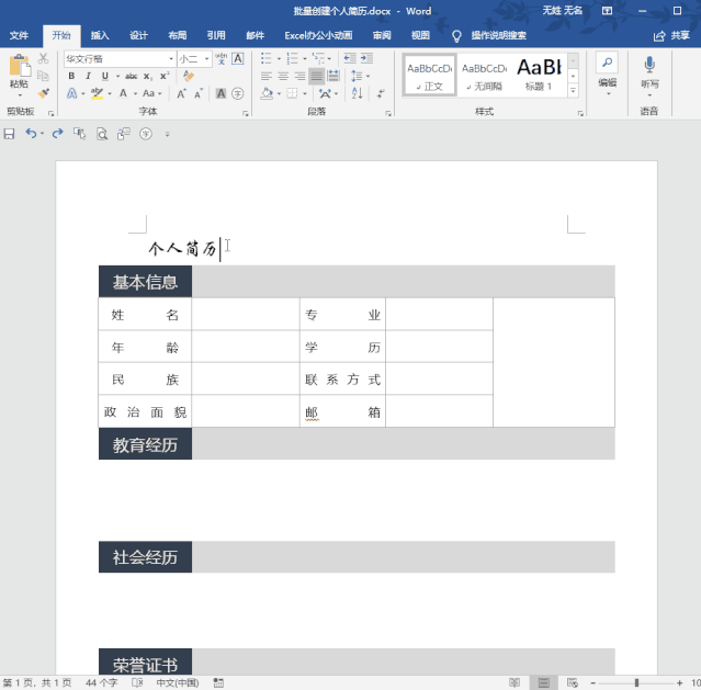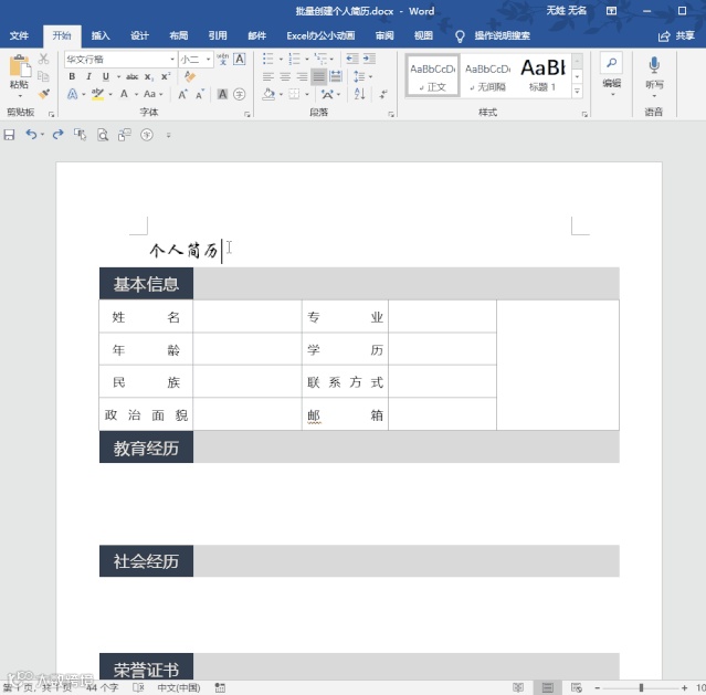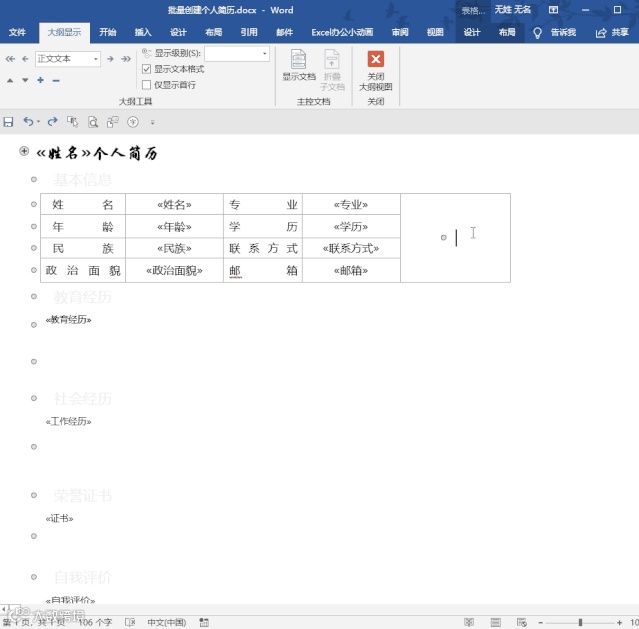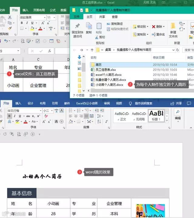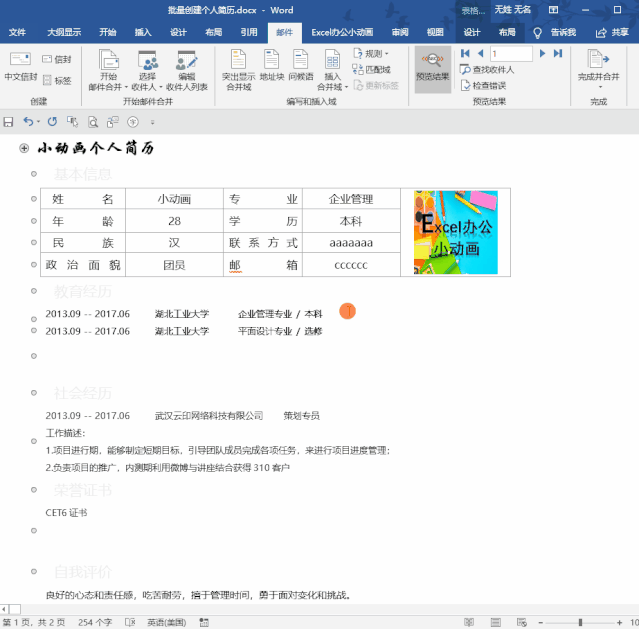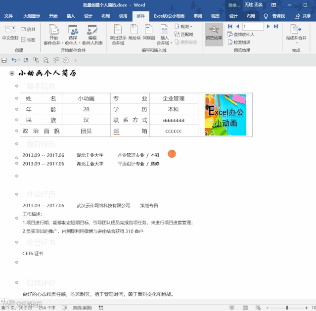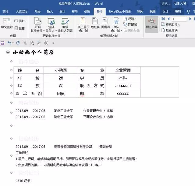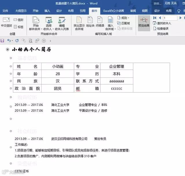 新员工入职需要登记他的个人信息在excel中,主管让我为每个员工创建独立的word个人简历表,没有想到利用邮件合并的功能就很快完成了!