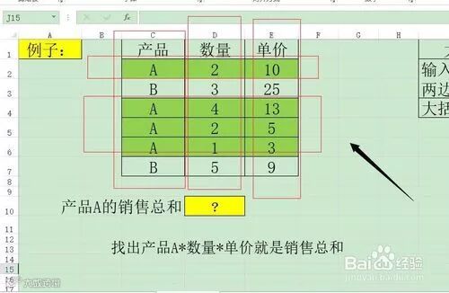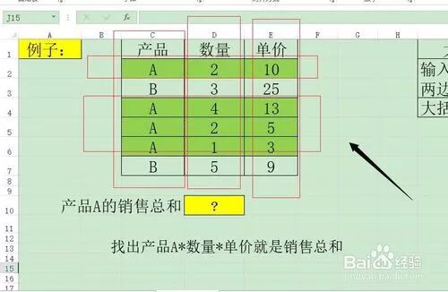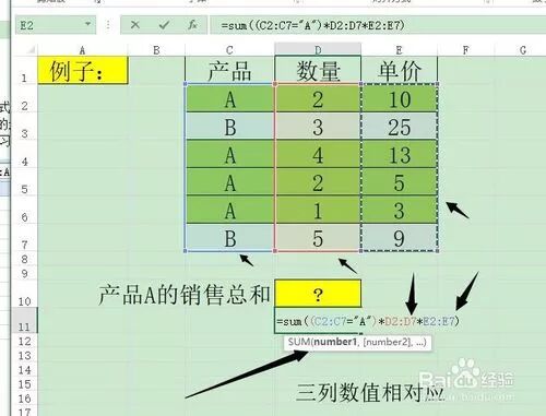 第五步:分析下如何使用数组,计算产品A的总和,商品列等于A的产品,对应的数量列乘以单价列
