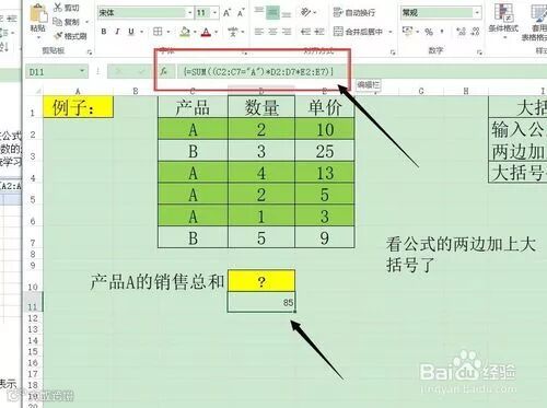 第六步:看结果,顺利的求出产品A的总和,这里数组运算必须使用大括号,不使用大括号会出现错误。