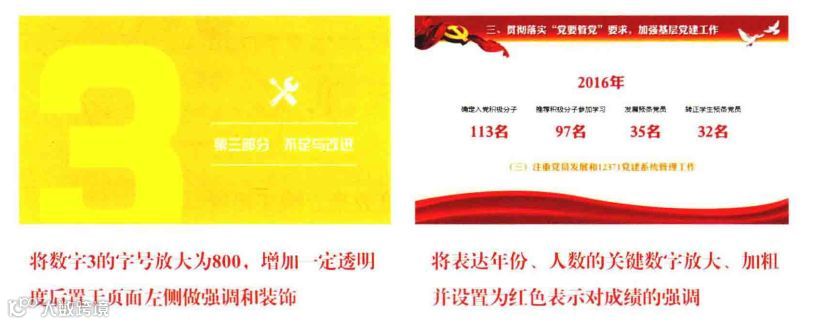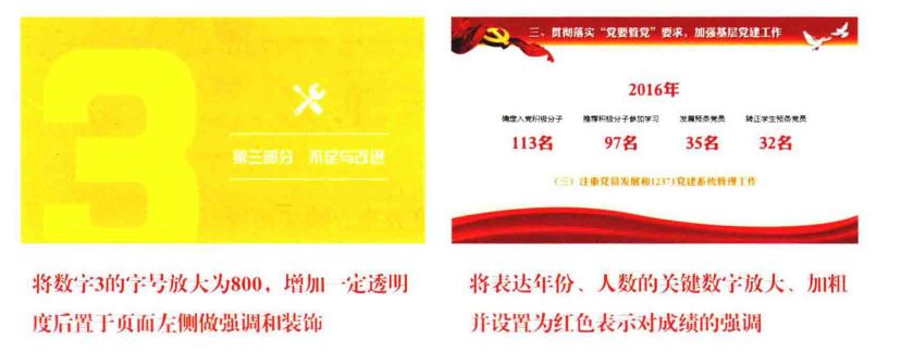 在PPT中,数字的另外一种作用是强调和美化, 如以名次、百分比、业绩等形式出现,或作为章节页的背景序号出现。但是要注意:这样使用数字时,数字的字号往往需要刻意进行放大,字体进行加粗,或添加1些额外的装饰效果才能出彩。