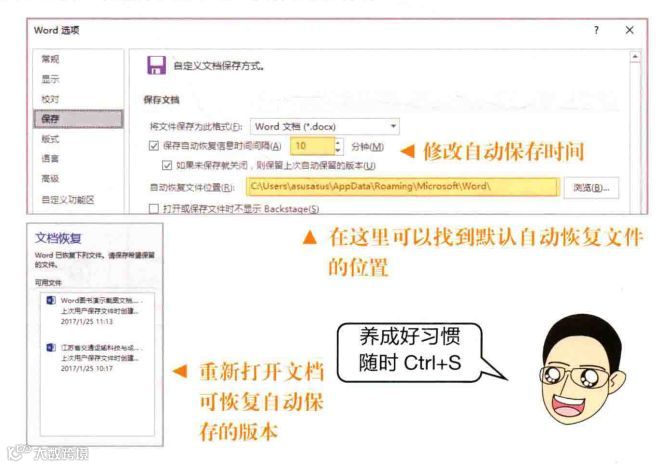 关于习惯3,具体操作是依次单击[文件]→[选项]→[保存],设置保存自动恢,复信息时间间隔X分钟(这里的时间间隔X分钟越小,其自动保存就越频繁),并勾选“如果未保存就关闭,请保留上次自动保留的版本”。