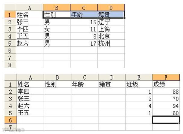 例如,基础数据表为“姓名,性别,年龄,籍贯”,而新表为“姓名,班级,成绩”,这两个表格的姓名顺序是不同的,我们想要讲两个表格匹配到一个表格内,或者我们想将基础数据表内的信息添加到新表格中,而当我们修改基础数据的同时,新表格数据也随之更新。