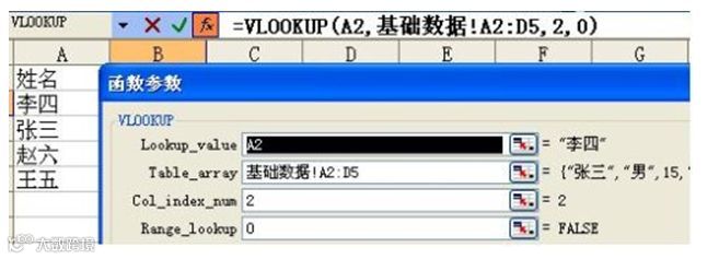 第三个参数为满足条件的数据在数组区域内中的列序号,在本例中,我们新表B2要提取的是“基础数据!$A$2:$D$5”这个区域中B2数据,根据第一个参数返回第几列的值,这里我们填入“2”,也就是返回性别的值(当然如果性别放置在G列,我们就输入7)。