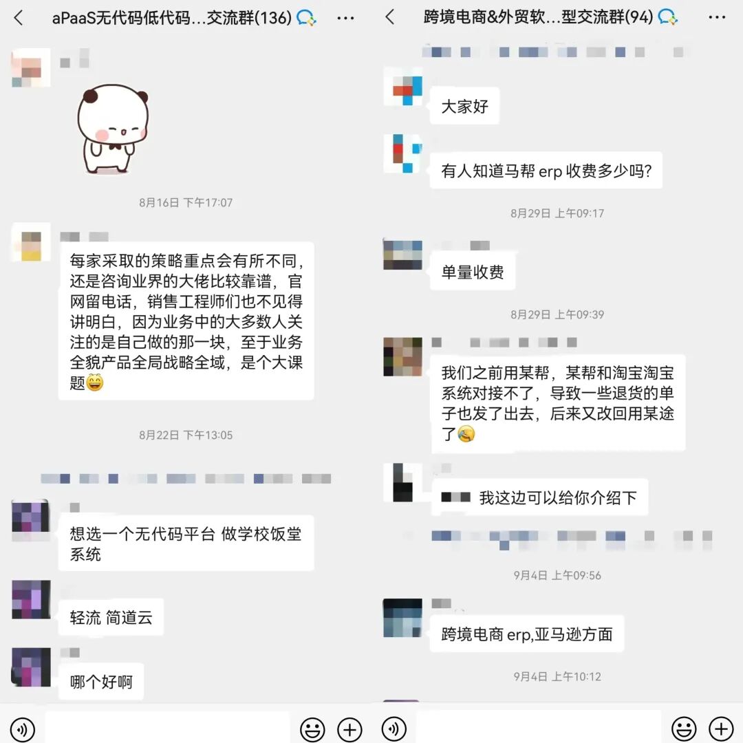 SaaS点评网旗下已建立数十个软件选型采购群,覆盖CRM、SCRM、OA、HRM、BI、ERP、电商、电子签、知识付费、视频会议、呼叫中心、在线客服、云安全等领域。社群成员以企业信息主管、采购负责人、业务负责人为主,同时每个群都有专业的数字化顾问入驻为群友免费答疑。