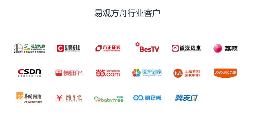 适用易观方舟的企业有易捷海购、财联社、方正证券、BesTV、九阳等等,帮助企业打通全端用户运营触点,与用户良性沟通互动,构建品牌和用户的“亲密关系”。