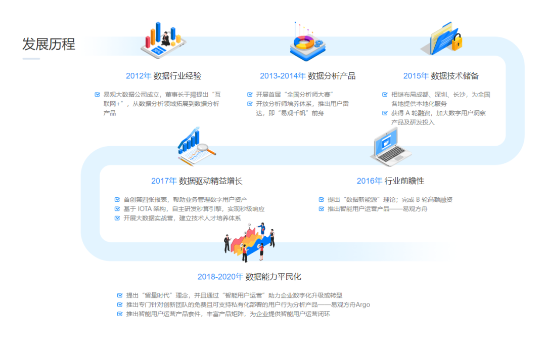 旗下易观方舟智能用户运营产品套件,将易观多年对行业和业务场景的深刻理解与先进的数据智能技术相结合,通过智能分析、智能运营和智能画像三款产品的强大功能,以优质的服务帮助企业构建和激活数字用户资产,高效完成用户需求感知(收数),全端数据打通(理数),关键行为分析(算数)和智能主动服务(用数)等关键环节,从而实现收入增长、成本降低和效率提升。
