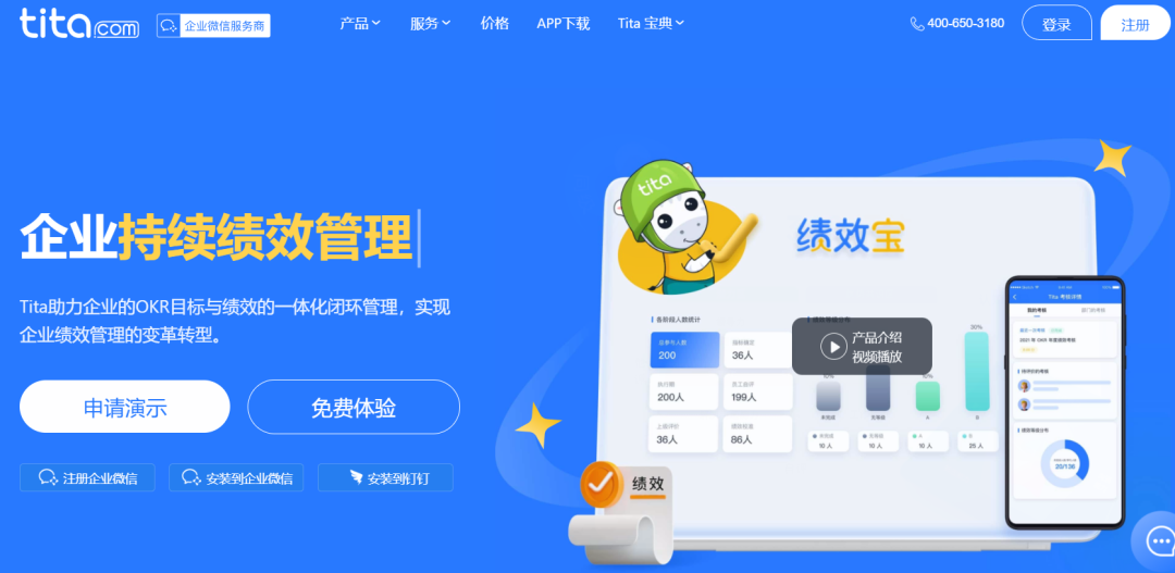 Tita绩效宝是一款敏捷的持续绩效管理工具,其全面支撑KPI评估、价值观考核、360评价、日常重点工作、OKR等考核场景。Tita支持高效、敏捷的绩效流程、绩效考核与工作执行结合,可以追踪过程、具有各行各业的考核模板、多元化的考核评价、可视化的考核结果等等。
