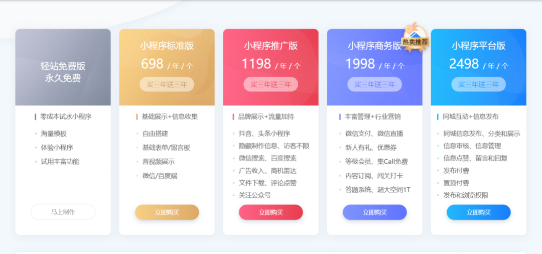 答:凡科小程序的价格因具体方案不同而有所不同,其官方网站上提供了多种套餐选择,有免费版、标准版、推广版、商务版、平台版。其中标准版698/年/个,推广版1198/年/个,商务版1998年/个,平台版2498/年/个。