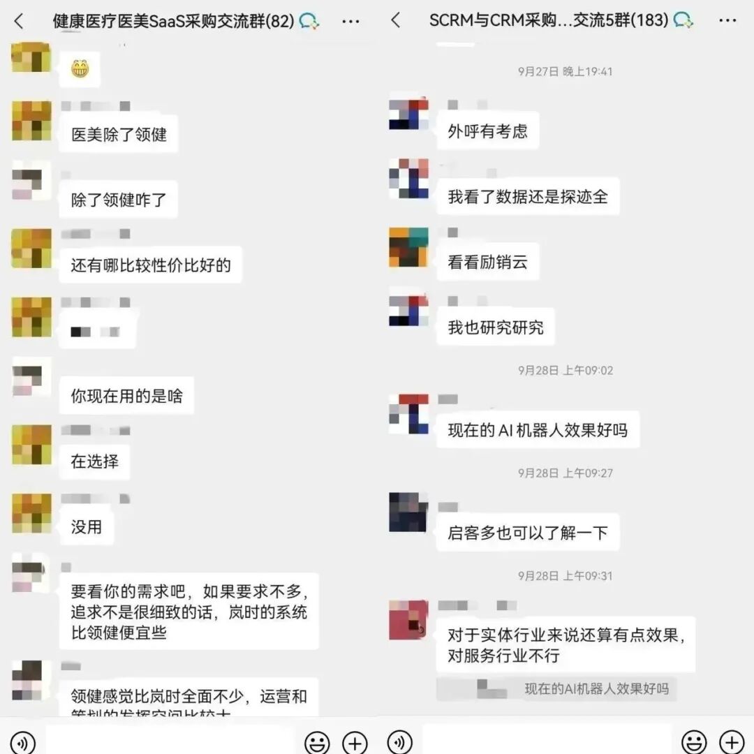 SaaS点评网旗下已建立数十个软件选型采购群,覆盖CRM、SCRM、OA、HRM、BI、ERP、电商、电子签、知识付费、视频会议、呼叫中心、在线客服、云安全等领域。社群成员以企业信息主管、采购负责人、业务负责人为主,同时每个群都有专业的数字化顾问入驻为群友免费答疑。