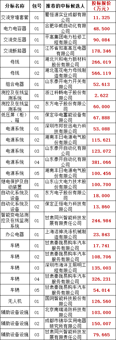 国网甘肃电力2025年第五次物资公开招标采购工作已经结束,依据《中华人民共和国招标投标法实施条例》、《招标公告和公示信息发布管理办法》对中标候选人公示的规定,现将评标委员会推荐的中标候选人予以公示,公示期 3 日。投标人或者其他利害关系人若对评标结果有异议的,请在中标候选人公示期间以书面形式(电子邮件)提出。