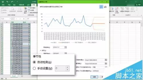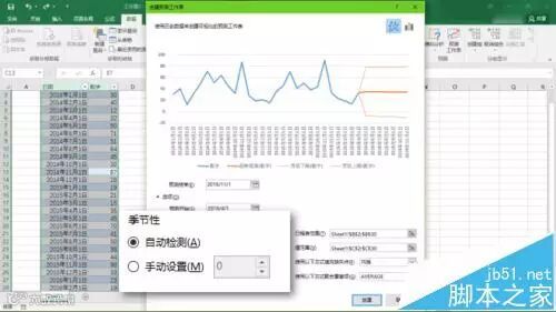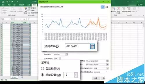 5、将“预测结束”日期选定到“2017/4/1”,将“季节设置”由“自动检测”改为“手动设置”并将其值设置为“12”。这样改的原因是,我们的原始数据为用户每月发布的经验篇数,数据范围从 2014 年 1 月份开始,至 2016 年 4 月份结束,每个周期为 12 个月;而且需要从最后一期数据(2016 年 4 月份)开始,向后预测 1 年以内的数据。