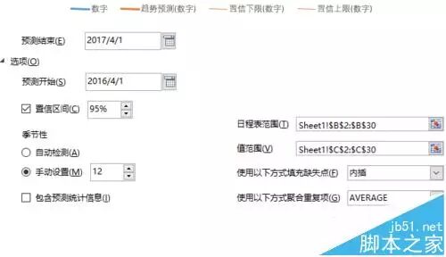 7、为了进一步了解 Excel 数据预测工作表的运行机制,下面让我们来仔细看看其他选项。除了上面提到的“预测结束”和“季节设置”之外,Excel 的预测工作表还有以下几个主要参数: