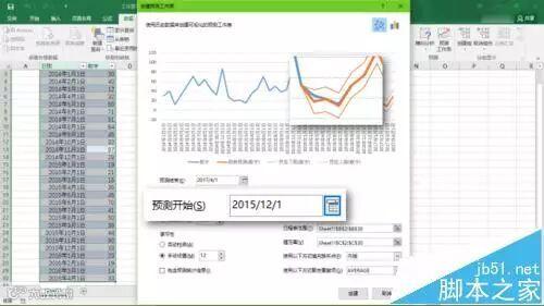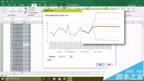 3、弹出“创建预测工作表”向导窗口。窗口为我们呈现了历史数据和未来预测数据的图表,其中蓝色折线是历史数据,橙色折线是未来预测数据。可以看到,表示未来预测数据的橙色折线基本上是平直的(Linear 或线性的),没有得到正确的预测。