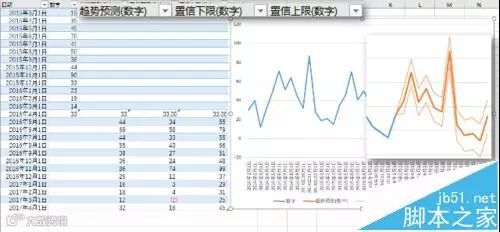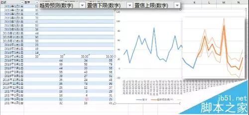 6、点击向导窗口中的“确定”按钮,Excel 将插入新的工作表,表中包含了原始数据,以及“趋势预测”、“置信下限”、“置信上限”三列预测数据;当然,还包括一个预测图表。由图表可以说直观地看出,根据 2014 年、2015 年两个年度的数据,该经验作者每年的 5 月份、10 月份为经验创作的高峰期,因为这两个月都有假期,基本上确定该作者是个宅男。