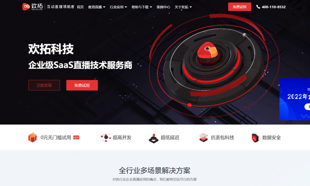 欢拓一直致力于提供行业领先的互动直播SaaS云服务,获得国家高新技术企业和科技创新小巨人企业认证。从2010年开始,欢拓就专注于音频、视频的采样、编码、后处理及智能传输等直播核心技术的研究,其产品线涵盖教育、金融、电商、会议、培训、大会、医疗等全行业直播场景。除提供标准化的直播管理系统外,欢拓还能根据企业需求,打造高度契合企业自身品牌化战略的直播系统,帮助客户实现业务高速增长。