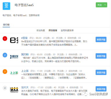 目前在SaaS点评网上的电子签名SaaS榜单中也收录了这四款产品,截至2022年5月,根据评分排序从高到低为e签宝、契约锁、上上签、法大大,NPS分数分别为88分、60分、17分、-17分。