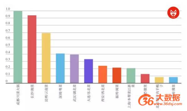 为了探究这一系列的问题,我们选取了位于我国东南西北的12个城市:北京、上海、深圳、成都、武汉、西安、长沙、大连、合肥、郑州、昆明、福州,涵盖北京菜、川菜、东北菜、闽菜、云南菜、上海菜、粤菜等多种代表菜系;以支付宝口碑提供的2016年10月1日到10月14日的千万级用户餐饮消费数据为基础进行消费热度分析。36大数据(http://www.36dsj.com/)