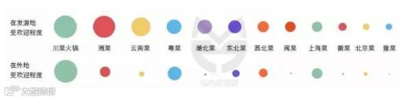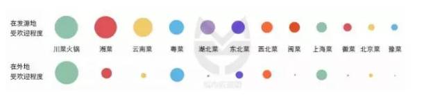 如果我们将各大菜系在其发源地和外地的受欢迎程度放在一起进行比较,将会发现更多有趣的结论: