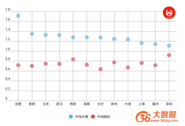 我们从12个城市的常住居民中选出了两类特殊的群体:娶了本地姑娘的外地女婿、以及嫁了本地小哥的外地媳妇(本地外地按籍贯区分)。我们分别比较了外地女婿和外地媳妇对本地菜的认可程度,并与本地人进行比较,得到了外地姻亲对本地菜的认可指数。若某类人的该指数大于1,说明该类人对当地菜的偏好程度比本地人要高,小于1则说明对当地菜的偏好程度比本地人要低。结果如下图: