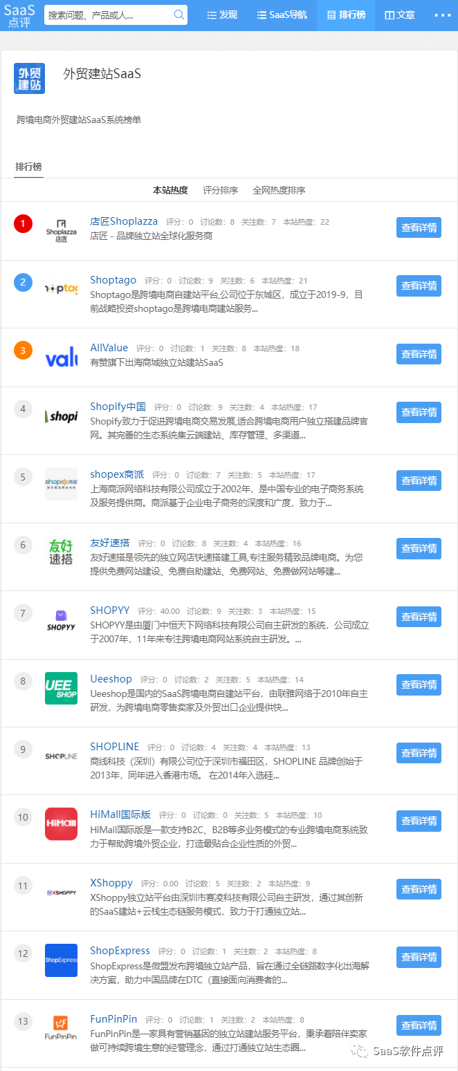 SaaS点评网自2019年上线以来不断收录用户评价,旨在帮助大家做出更好的选择。目前国内此类产品较多,本站收录了13个,例如Shoptago、AllValue、shopify商派等。本文介绍跨境电商独立站排行榜单。