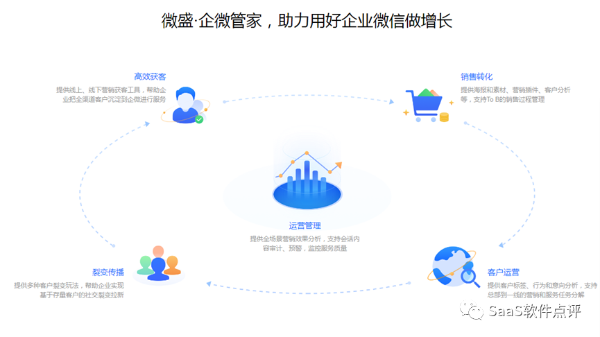 微盛成立于 2015年,是腾讯红杉的投后公司,团队规模一千人,在广州、深圳、北京、上海、无锡、武汉等 21个城市均设有分公司。基于企业微信的营销和服务平台,围绕「引流获客」、「营销转化」、「运营管理」三种场景,帮助企业解决获客难、运营效率低和客户资产流失等问题,助力用好企业微信做增长。功能有存档聊天记录、描绘客户画像、管理客户生命周期、群运营、多维度数据分析等等。